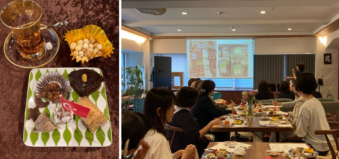 Throughout the presentation, Ms. Harumi Ito served us different types of black tea, including Çay Çiçeği and Siyah Çay, as well as Mila Tea, a black tea flavored with bergamot. The teas were served in delicate tulip-shaped glasses that help retain heat — a traditional and elegant way to enjoy Turkish tea. Ms. Oe Shizuyo also introduced us to Elma Çay, a tea made from dried apples rehydrated in hot water, Nar Çay, a pomegranate tea, and other herbal infusions made from various plants, appreciated both for their taste and their health benefits.