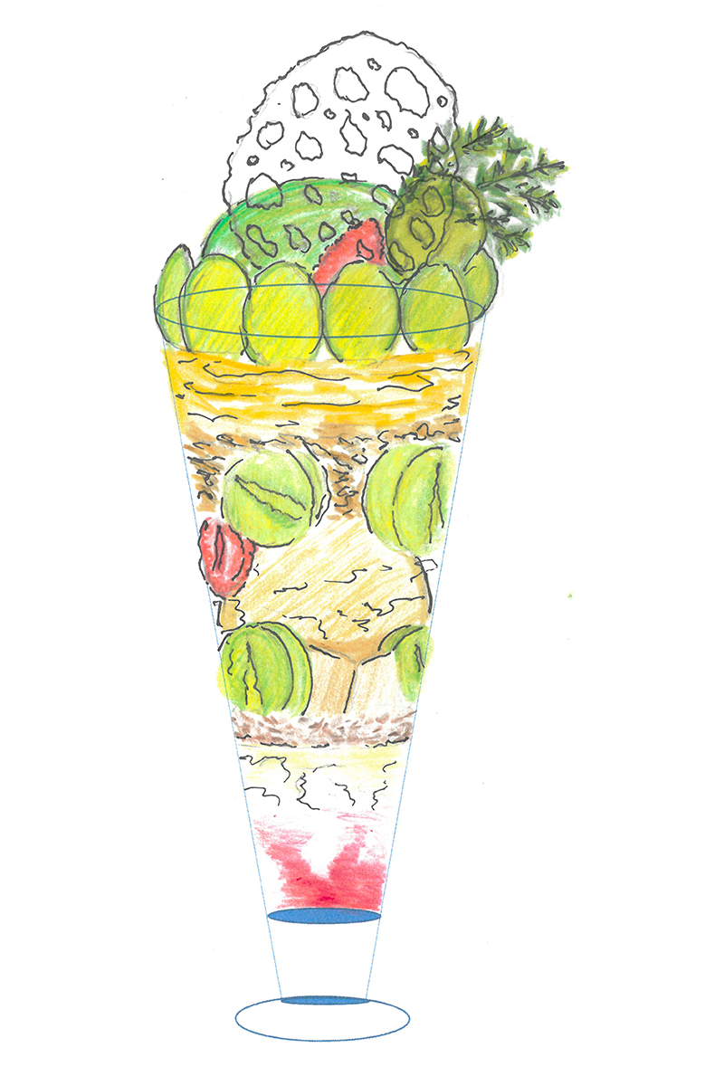 Presented alongside the beautiful finished parfait, we are excited to share an image sketch hand-drawn by Patissier Chef Maya Kumegawa. The casual strokes of his sketch reveal not only the plating ideas but also the playful creativity behind the dessert.