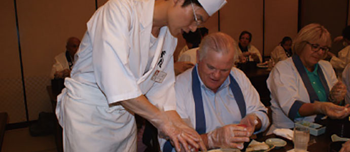 This “sushi-nigiri” (sushi-making) event is open to groups of two or more people. Participants are taken into a spacious Japanese tatamifloored room with a tokonom alcove, with a deeply Japanese mood. They start by getting ready, dressing in matching jackets. Staff in traditional Japanese dress explain the history of sushi, then a highly-trained itamae (chef) gives a demonstration of “tai no sanmae oroshi” (filleting bream into three cuts) and sushi assembly for the guests to watch. Then, the guests get to try it for themselves. They are provided with cuts of maguro (tuna), salmon, ebi (shrimp), and other sushi toppings, sushi rice, wasabi horeseradish, and nori (seaweed sheet), and try their hands at assembling their own sushi, with the itamae’s guidance. The next stage, after the sushi is ready, is a tasting and mealtime. Check the taste and appearance of your own sushi alongside the work of the pros. The participants receive graduation certificates from the itamae who taught them. This could be your chance to try sushi-making and become an on-the-spot sushi chef!