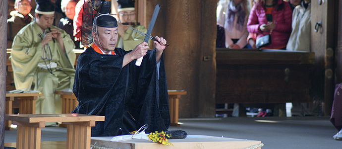Accompanied by gagaku music played on traditional Japanese instruments, the whiterobed chief priest purifies a large wooden cutting board placed on the ground, then places a single carp on the board as the food to be cut. The carp has traditionally been held in highest esteem in Japan, and is widely used in religious ceremonies. After that, the current Mr. Shijo, clad in Heian-era robes, makes a stately entrance and sits before the cutting board.