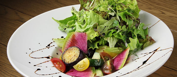 First, there's "Phyto Rich Salad". Vegetables rich in phytochemicals, like potato, kabocha squash, and tomato are blended with an anchovy sauce, with lots of herbs and leaves added on top, followed by balsamico sauce.