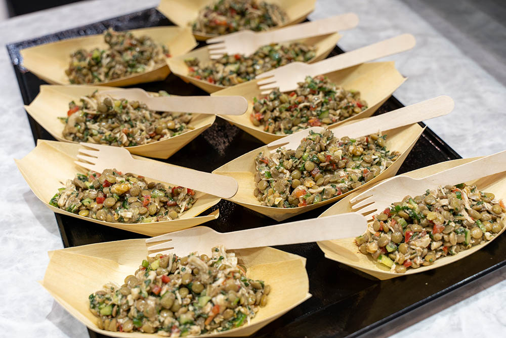 At the Trend Stage, recipes using novel Turkish ingredients were introduced for four days, and cooking demonstrations and tastings of those recipes were offered. Let's take a look at some of the tasting items, pictured below. One is falafel with tahini sauce, and the other is chicken and lentil salad. He prepared the food personally and served it on small plates, which were distributed to visitors for tasting. One visitor who tasted the food said, "I had never been aware of Turkish ingredients before. I didn't know they could taste this good. I want to head to a Turkish restaurant next and really savor them!" . A visitor who works in food service said, "I didn't get a clear sense of the ingredients when I looked around the booths, but after seeing the chefs' cooking demonstrations and actually eating the food, I thought I'd like to serve it at our restaurant."