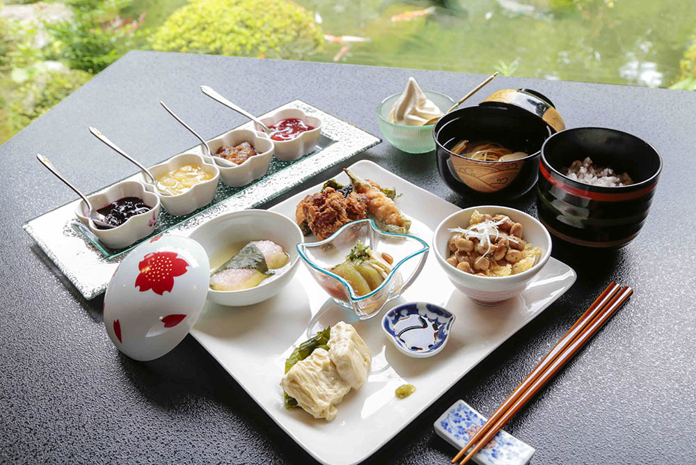 At Kakurinbo, the "Oteranchi," a yuba (tofu skin) dish served at the temple, is highly recommended. The "Yuba Gozen," a set meal with seasonal ingredients and yuba, is also excellent. That's because tasting the seasonal ingredients of the moment is the most delicious, nutritious, and luxurious way to eat. Yuba is high in protein and low in calories and contains no cholesterol. It is truly a Japanese superfood. Its composition centers on soy isoflavones, which are highly effective for beauty, combined with saponins, which have antioxidant properties, and diverse amino acids, all in an excellent balance. It has many vegetarian and vegan fans.