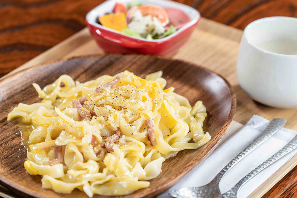 The Farm Cafe is built within Ebisuya. Here, they use regional ingredients and take care to create authentic meals under the motto of local gastronomy. Inside the cafe, you can enjoy a peaceful time while looking out at the garden and feeling the changing seasons. Many people come from far and wide to enjoy meals and cafe time amid the charmingly colored chairs and counters. The popular "Hoto* Carbonara" and the staff's homemade "Minobu Canelé" are new additions to the menu and are gaining a following. Please give them a try!