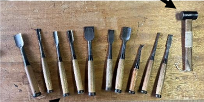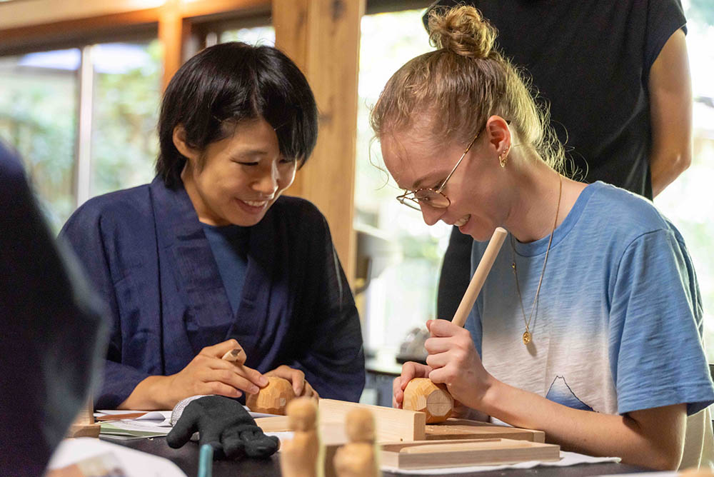 Now let's look at the second precious experience that can only be taught here. The teachers are Shinmyo Aonuma, a Buddhist statue sculptor, and his wife, Sowa Aonuma. The first step is "arahori" (rough carving), which involves carving out the face with a large blade while leaving the corners intact. Next comes the "kozukuri" (fine crafting) process, in which fine details are finished using smaller chisels, and finally, the entire piece is finished using an even sharper blade. The two Buddhist sculptors will carefully teach you the techniques, so you can feel at ease even if you've never used a chisel. Of course, you can take your work home with you.