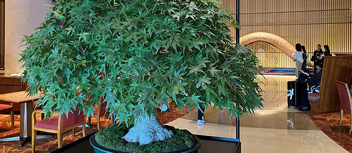 Within the twinkling, cathedral-like soaring lobby of The Peninsula Tokyo hotel, a forest of astonished tiny trees on individual plates and podiums surveyed the delighted party in progress. One centenarian Japanese maple (Acer palmatum), contemplating its many decades of life, meticulously tended by generations of adoring experts, found itself daydreaming of its approaching autumn holiday in the soaring urbane foyer and twinkling lighting. Its grey elephantine trunk oozed into thick roots, plunging luxuriously into the green mossy blanket below. Its branching cap of late summer deep-green leaves kept overly inquiring hands at a polite distance. Balancing lightly yet anchored securely in their home in alarmingly shallow ceramic boats, perched on tall pedestals, the lordly arboreals serenely tolerated appreciative onlookers leave-to-eye.